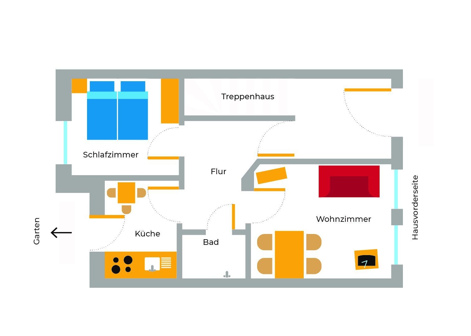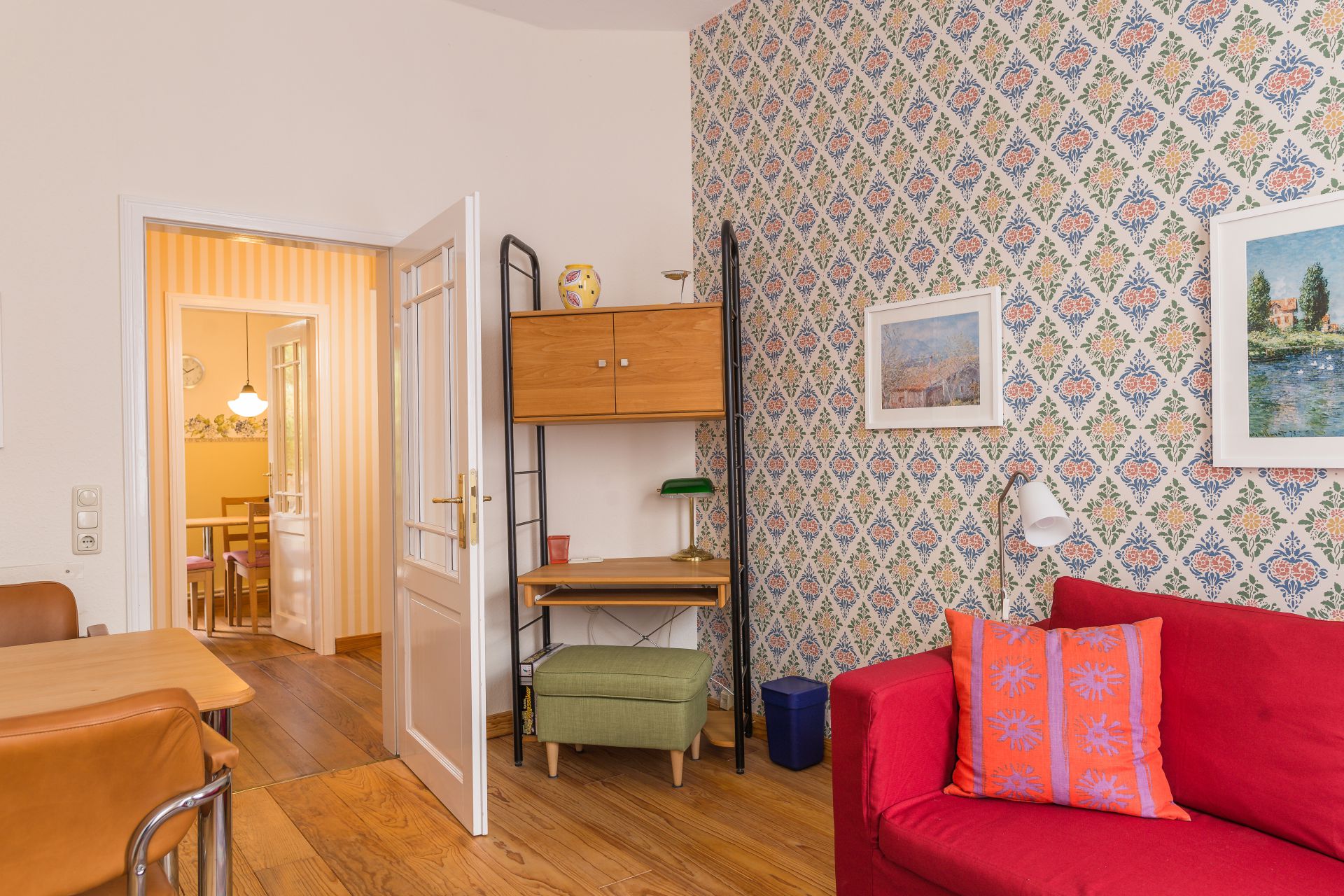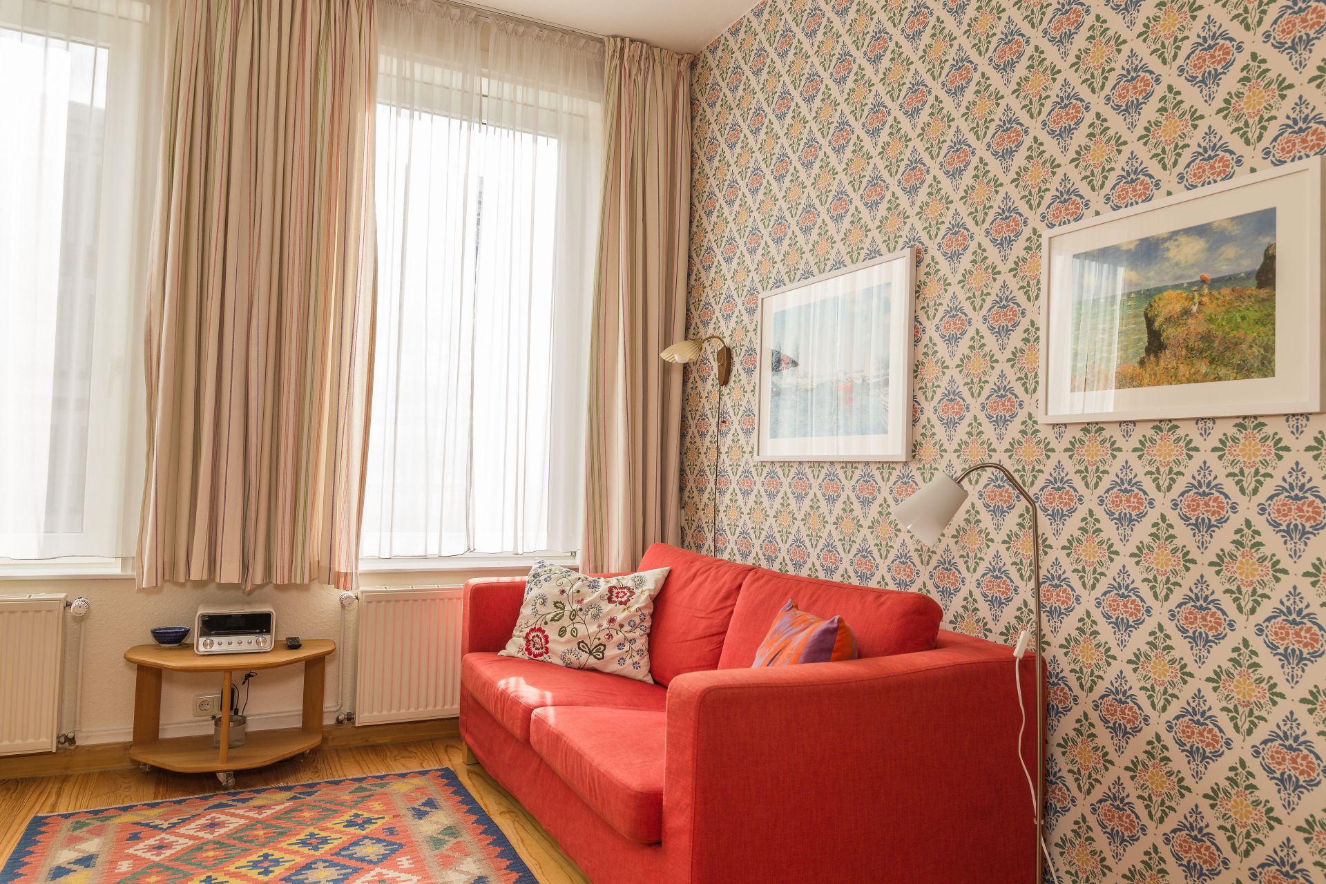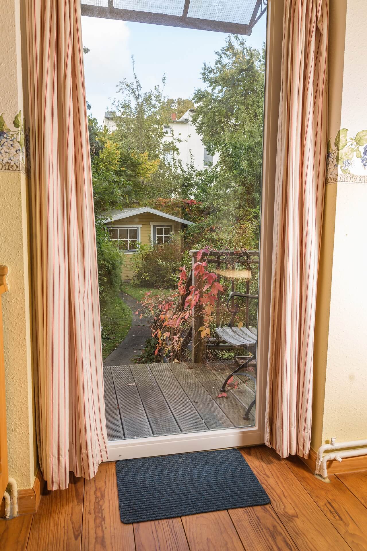 Die Deckenhöhe von über 3 Metern und große Fensterflächen sorgen in dieser sanierten Altbauwohnung für lichtdurchflutete Räume und ein sehr behagliches Wohnklima. Die Wohnung ist geeignet für 1-2 Personen und hat einen direkten Ausgang zum Garten mit Grillplatz und Gartensauna.